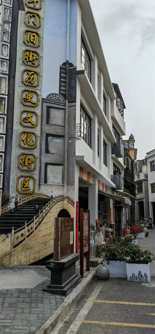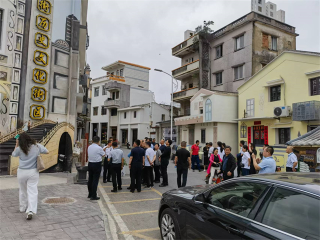 周勇會長一行首先來到了斗門歷史文化街區。斗門舊街位于斗門鎮核心區域,十九世紀末到二十世紀初由加拿大牧師、建筑工程師嘉理慰等人規劃設計,是一條具集市貿易功能的商業街。全街呈“丁”字形,全長500多米,街道兩旁是緊密排列的騎樓商鋪,建筑風格獨特,博采歐美各國古典建筑之精華、吸取南洋島國之建筑理念、秉承中國嶺南建筑之風騷。斗門舊街在明嘉靖年間就形成了墟市,發展于清雍正十一年,2022年2月,珠海市為了更好的保護舊街古跡、再現地方特色和文化價值,對其啟動了修繕工程,先后修繕了包括20棟歷史建筑、30棟風貌建筑、24棟一般建筑在內的74棟建筑,修繕內容包括對外墻面翻新、灰塑壁畫修復、門窗保養及部分環境風貌整治等。